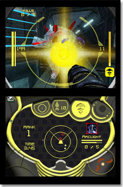 There is the issue of controls, which greatly affect your gameplay experience. To be perfectly honest, they’re abysmal. There are four predetermined control settings to choose from, two using the stylus, and the other using the buttons. Whoever thought touch screen controls would ever be able to work in a game as hectic and intense as Hunters ought to be fired. There is just no grasping this control setting. Stylus controls are the default setting too, so first time players may immediately start disliking the game because of how crazy it is to control. The two dual modes are the only user-friendly control settings, but even they take some time to get used to. Now, I understand my microrant about the controls seems opinionated, but I’m sure one thing we can all agree on is that being able to select custom controls would greatly benefit everyone’s enjoyment of the game. Everyone has a different preference, and maybe Nintendo should have realized that, especially with their first handheld FPS.